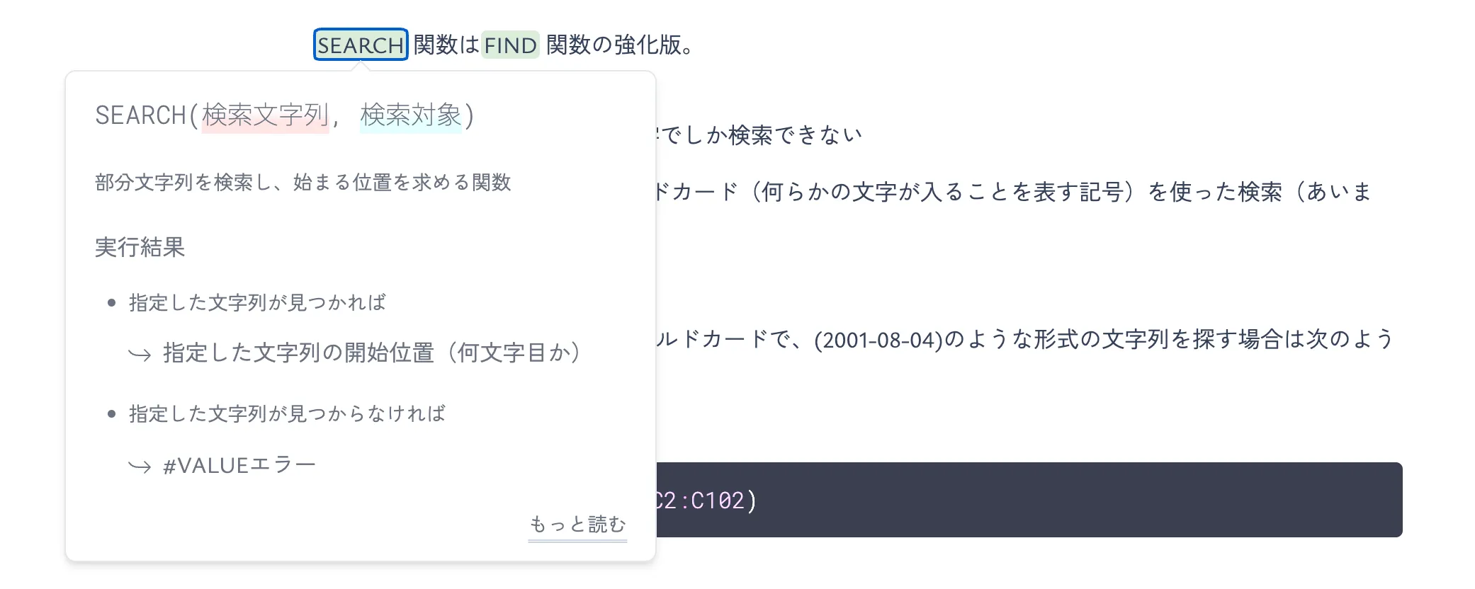 シグネチャや返り値を確認しながら読み進めることができ、「もっと読む」で詳細な解説(関数ごとのリファレンスページ)にアクセスすることも可能です。