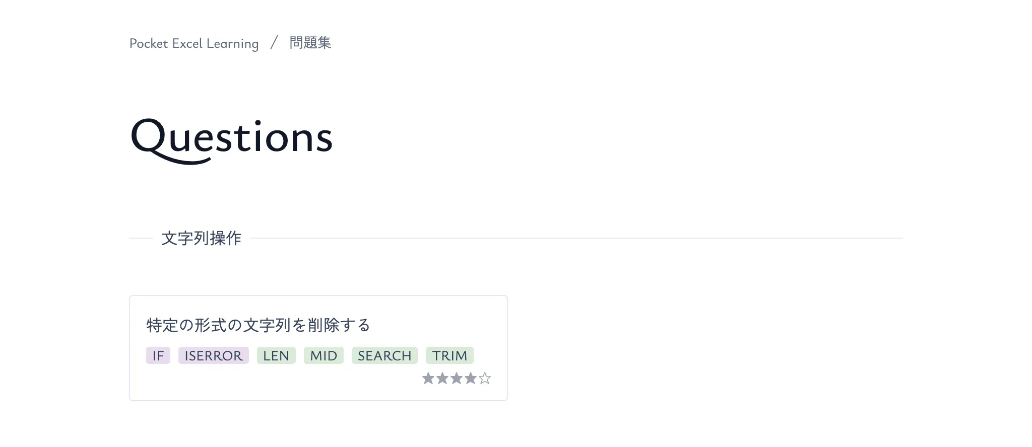 問題一覧ページでは、難易度や使用する関数を明示しています。