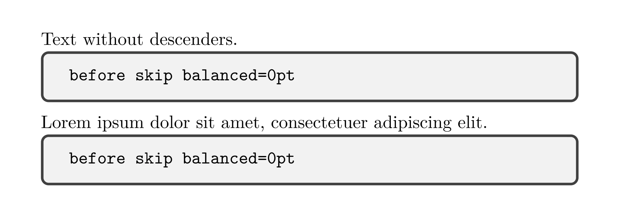 一方、before skip balanced=0ptを指定した場合は、0ptを指定しているにもかかわらず、少しテキストとボックスの間隔にゆとりが生まれます。