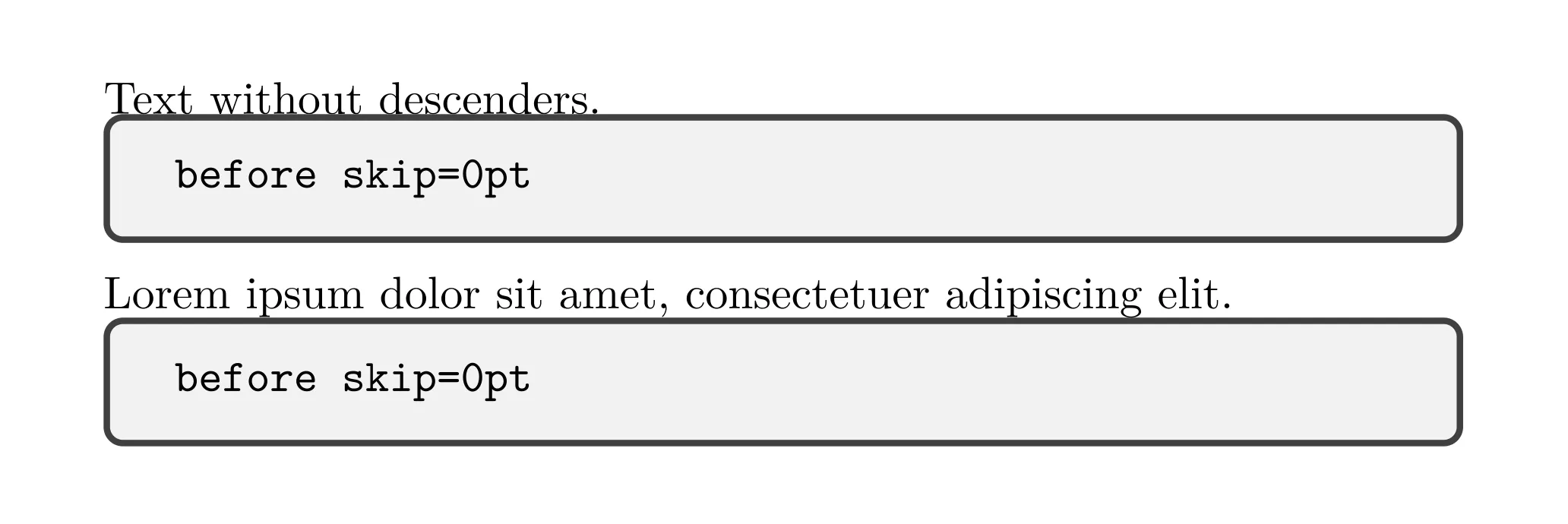 before skip=0ptを指定した場合は、ボックスの前のテキストの文字の下端が、ボックスの上辺にべったりくっついてしまいます。0ptを指定したことで、完全に間隔が0になっているのです。